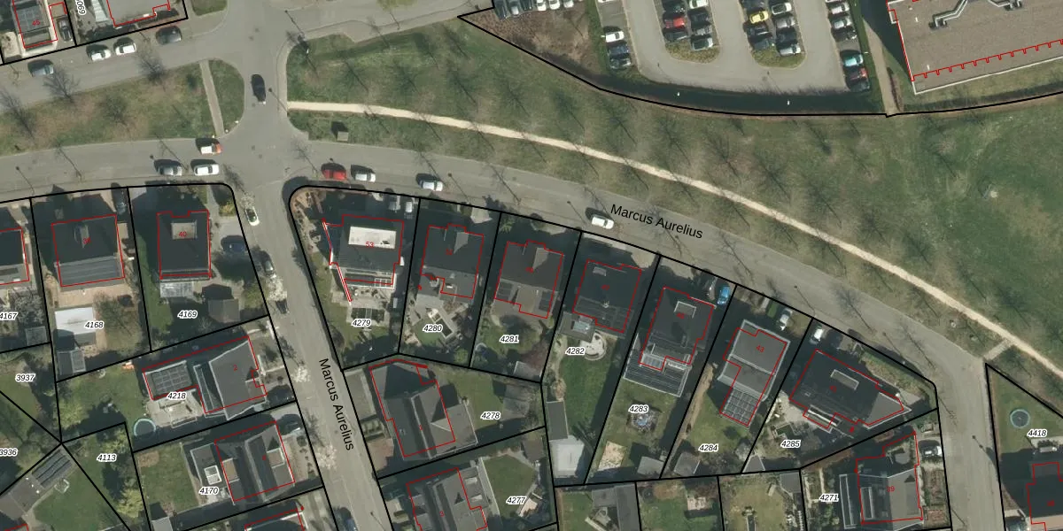 Het perceel waarop Marcus Aurelius 49 staat heeft een oppervlakte van 443 m². Dit is een groot perceel. De perceeloppervlakte wordt geregistreerd door het Kadaster. Gedetailleerde informatie over de maten van dit perceel kunt u vinden in het rapport Kadastrale kaart met maatvoering van Marcus Aurelius 49.