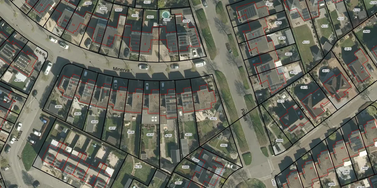Het perceel waarop Minerva 3 staat heeft een oppervlakte van 376 m². Dit is een groot perceel. De perceeloppervlakte wordt geregistreerd door het Kadaster. Gedetailleerde informatie over de maten van dit perceel kunt u vinden in het rapport Kadastrale kaart met maatvoering van Minerva 3.