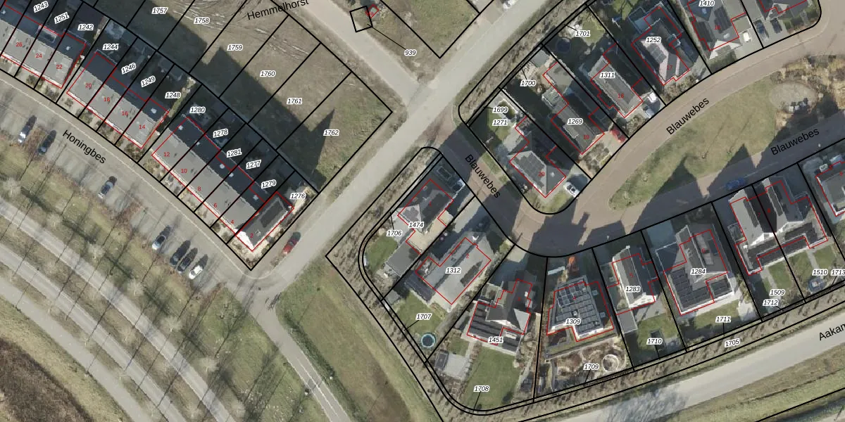 Het perceel waarop Blauwebes 1 staat heeft een oppervlakte van 376 m². Dit is een groot perceel. De perceeloppervlakte wordt geregistreerd door het Kadaster. Gedetailleerde informatie over de maten van dit perceel kunt u vinden in het rapport Kadastrale kaart met maatvoering van Blauwebes 1.