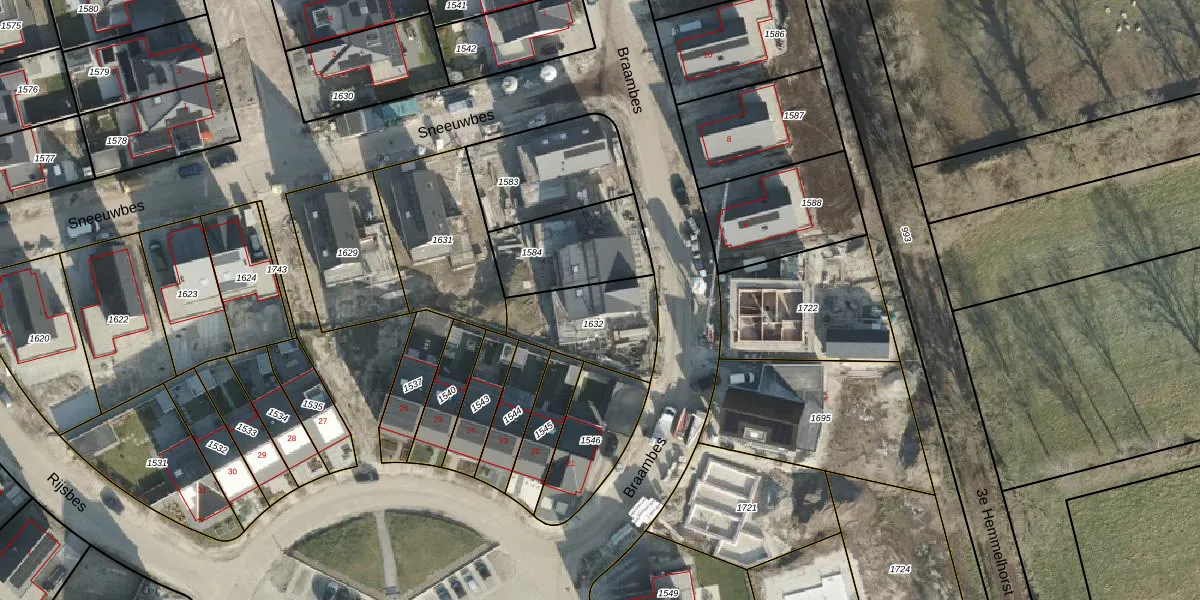 Het perceel waarop Braambes 1 staat heeft een oppervlakte van 308 m². Dit is een groot perceel. De perceeloppervlakte wordt geregistreerd door het Kadaster. Gedetailleerde informatie over de maten van dit perceel kunt u vinden in het rapport Kadastrale kaart met maatvoering van Braambes 1.