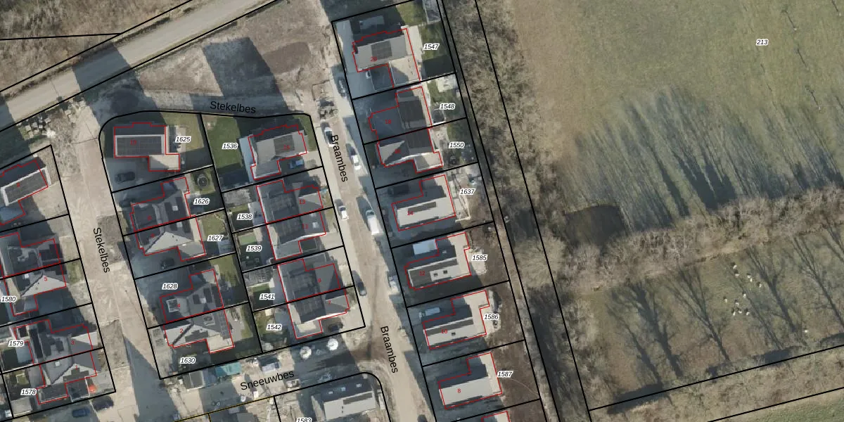 Het perceel waarop Braambes 14 staat heeft een oppervlakte van 369 m². Dit is een groot perceel. De perceeloppervlakte wordt geregistreerd door het Kadaster. Gedetailleerde informatie over de maten van dit perceel kunt u vinden in het rapport Kadastrale kaart met maatvoering van Braambes 14.
