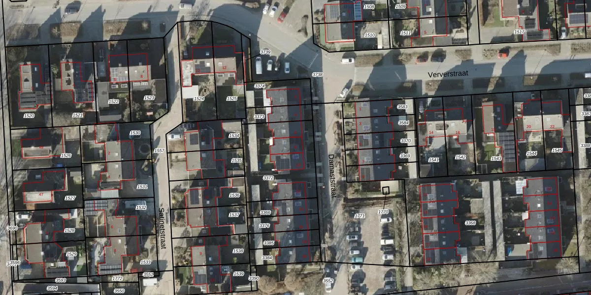 Het perceel waarop Damaststraat 8 staat heeft een oppervlakte van 632 m². Dit is een groot perceel. De perceeloppervlakte wordt geregistreerd door het Kadaster. Gedetailleerde informatie over de maten van dit perceel kunt u vinden in het rapport Kadastrale kaart met maatvoering van Damaststraat 8.