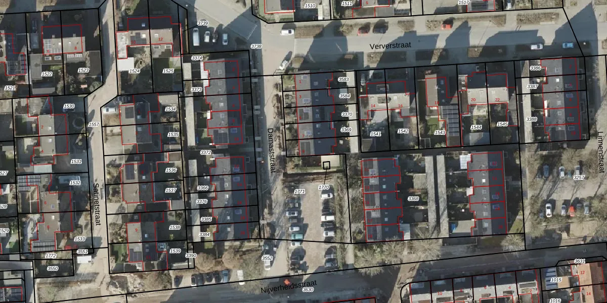 Het perceel waarop Damaststraat 9 staat heeft een oppervlakte van 1850 m². Dit is een zeer groot perceel. De perceeloppervlakte wordt geregistreerd door het Kadaster. Gedetailleerde informatie over de maten van dit perceel kunt u vinden in het rapport Kadastrale kaart met maatvoering van Damaststraat 9.