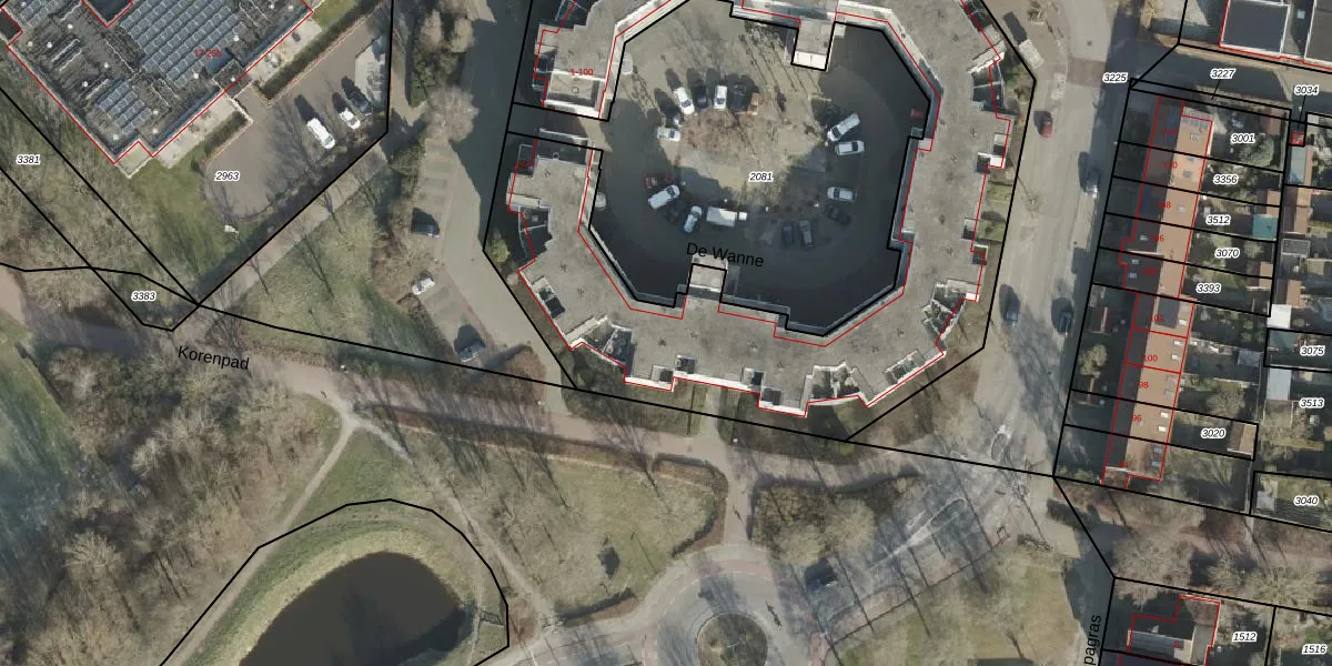 Het perceel waarop De Wanne 25 staat heeft een oppervlakte van 3293 m². Dit is een zeer groot perceel. De perceeloppervlakte wordt geregistreerd door het Kadaster. Gedetailleerde informatie over de maten van dit perceel kunt u vinden in het rapport Kadastrale kaart met maatvoering van De Wanne 25.
