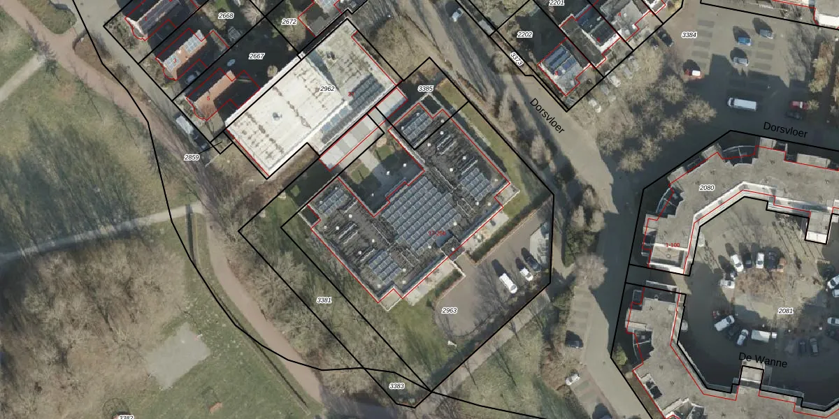 Het perceel waarop Dorsvloer 25-b staat heeft een oppervlakte van 2600 m². Dit is een zeer groot perceel. De perceeloppervlakte wordt geregistreerd door het Kadaster. Gedetailleerde informatie over de maten van dit perceel kunt u vinden in het rapport Kadastrale kaart met maatvoering van Dorsvloer 25-b.
