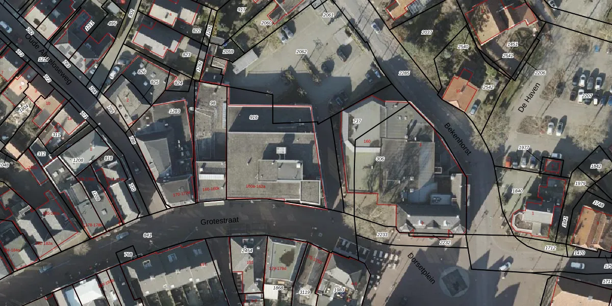 Het perceel waarop Grotestraat 160-a staat heeft een oppervlakte van 1107 m². Dit is een zeer groot perceel. De perceeloppervlakte wordt geregistreerd door het Kadaster. Gedetailleerde informatie over de maten van dit perceel kunt u vinden in het rapport Kadastrale kaart met maatvoering van Grotestraat 160-a.