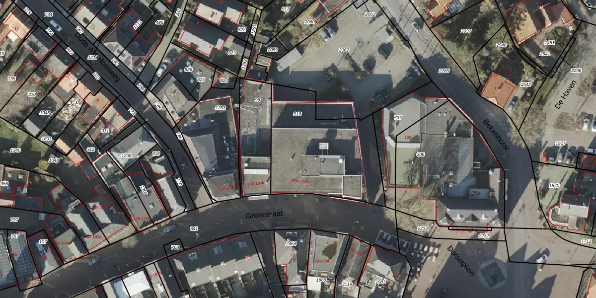 Het perceel waarop Grotestraat 160-b staat heeft een oppervlakte van 1107 m². Dit is een zeer groot perceel. De perceeloppervlakte wordt geregistreerd door het Kadaster. Gedetailleerde informatie over de maten van dit perceel kunt u vinden in het rapport Kadastrale kaart met maatvoering van Grotestraat 160-b.