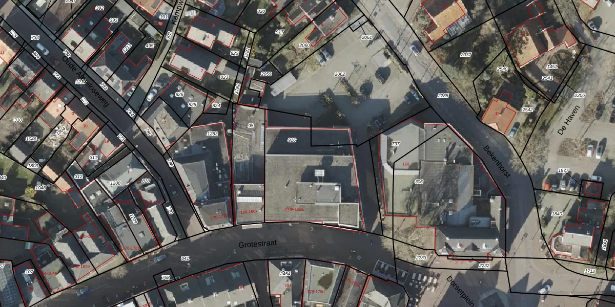 Het perceel waarop Grotestraat 160-c staat heeft een oppervlakte van 1107 m². Dit is een zeer groot perceel. De perceeloppervlakte wordt geregistreerd door het Kadaster. Gedetailleerde informatie over de maten van dit perceel kunt u vinden in het rapport Kadastrale kaart met maatvoering van Grotestraat 160-c.
