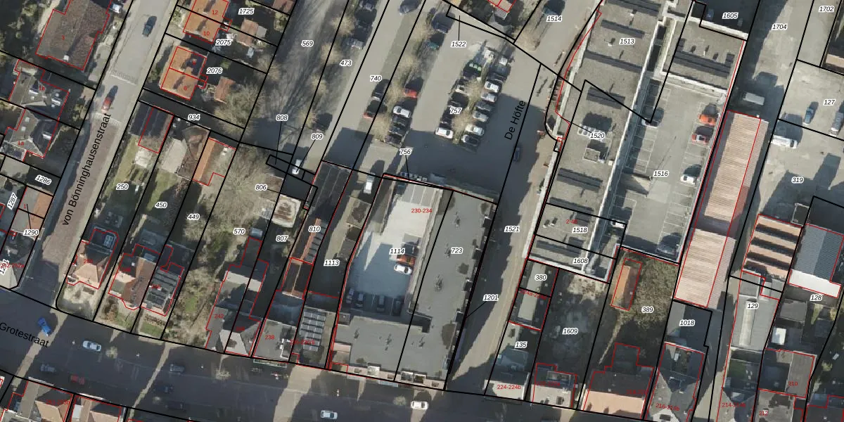 Het perceel waarop Grotestraat 230 staat heeft een oppervlakte van 822 m². Dit is een groot perceel. De perceeloppervlakte wordt geregistreerd door het Kadaster. Gedetailleerde informatie over de maten van dit perceel kunt u vinden in het rapport Kadastrale kaart met maatvoering van Grotestraat 230.
