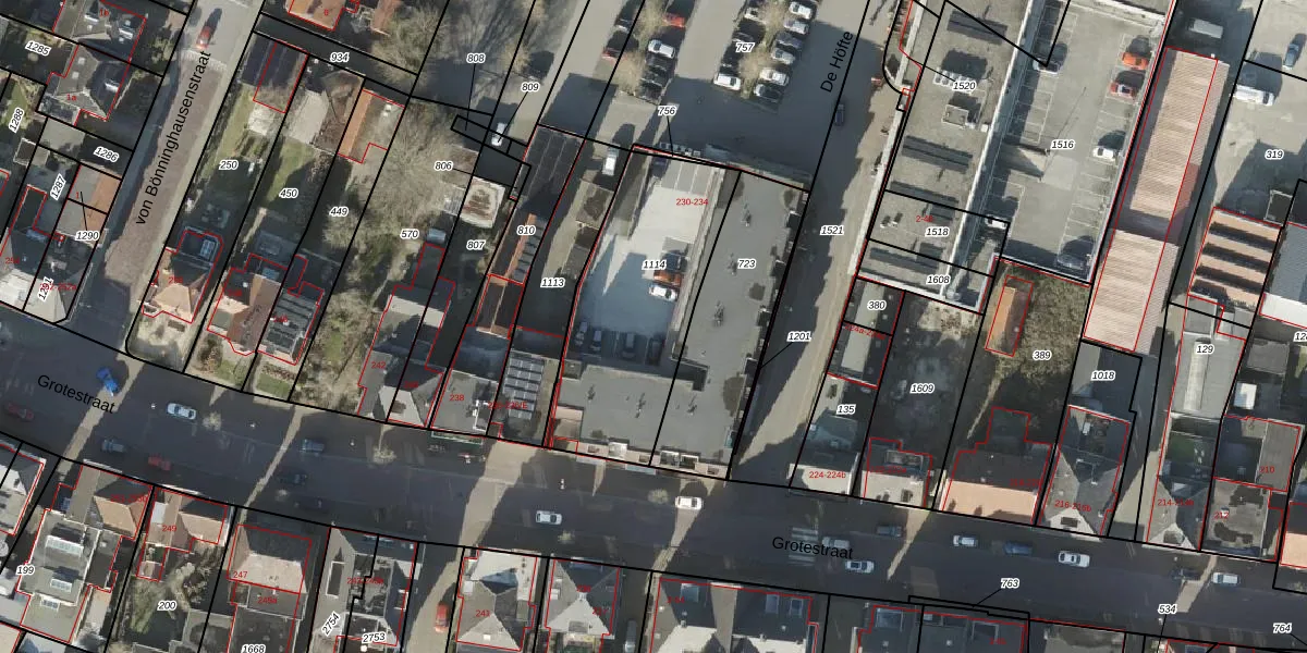 Het perceel waarop Grotestraat 230-e staat heeft een oppervlakte van 822 m². Dit is een groot perceel. De perceeloppervlakte wordt geregistreerd door het Kadaster. Gedetailleerde informatie over de maten van dit perceel kunt u vinden in het rapport Kadastrale kaart met maatvoering van Grotestraat 230-e.