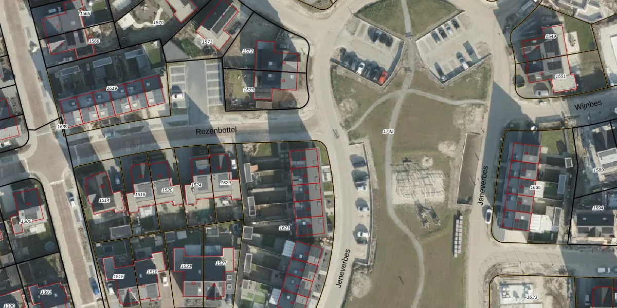 Het perceel waarop Jeneverbes 34 staat heeft een oppervlakte van 1653 m². Dit is een zeer groot perceel. De perceeloppervlakte wordt geregistreerd door het Kadaster. Gedetailleerde informatie over de maten van dit perceel kunt u vinden in het rapport Kadastrale kaart met maatvoering van Jeneverbes 34.