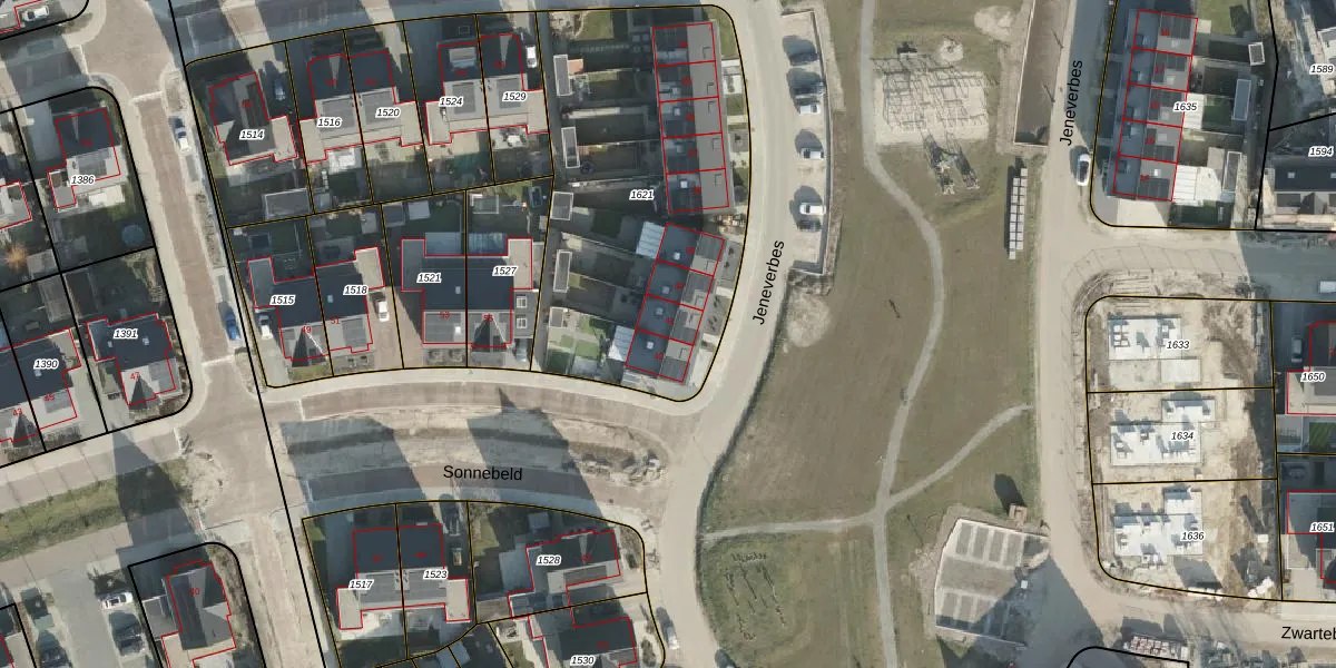 Het perceel waarop Jeneverbes 41 staat heeft een oppervlakte van 1653 m². Dit is een zeer groot perceel. De perceeloppervlakte wordt geregistreerd door het Kadaster. Gedetailleerde informatie over de maten van dit perceel kunt u vinden in het rapport Kadastrale kaart met maatvoering van Jeneverbes 41.
