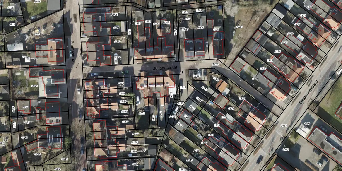 Het perceel waarop Julianastraat 2 staat heeft een oppervlakte van 158 m². Dit is een middelgroot perceel. De perceeloppervlakte wordt geregistreerd door het Kadaster. Gedetailleerde informatie over de maten van dit perceel kunt u vinden in het rapport Kadastrale kaart met maatvoering van Julianastraat 2.