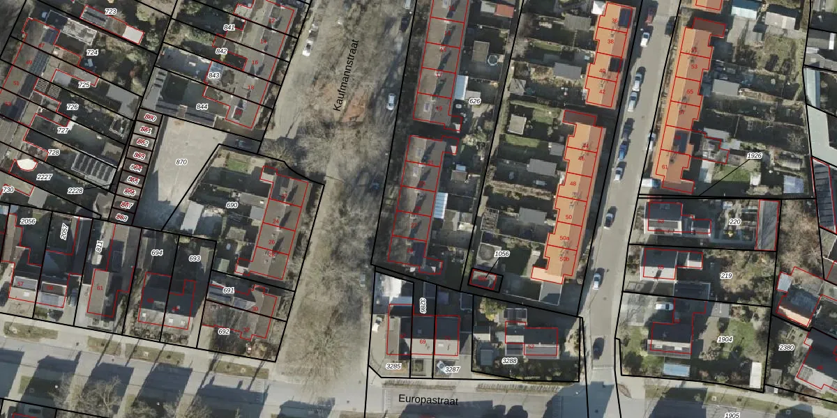 Het perceel waarop Kaufmannstraat 25 staat heeft een oppervlakte van 1870 m². Dit is een zeer groot perceel. De perceeloppervlakte wordt geregistreerd door het Kadaster. Gedetailleerde informatie over de maten van dit perceel kunt u vinden in het rapport Kadastrale kaart met maatvoering van Kaufmannstraat 25.
