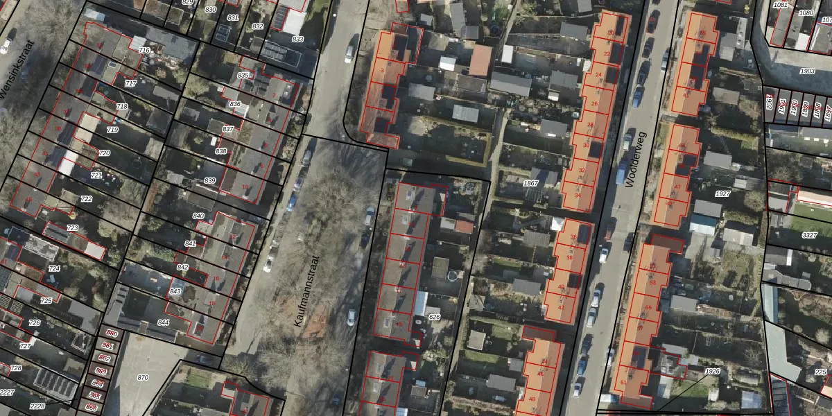 Het perceel waarop Kaufmannstraat 9 staat heeft een oppervlakte van 1870 m². Dit is een zeer groot perceel. De perceeloppervlakte wordt geregistreerd door het Kadaster. Gedetailleerde informatie over de maten van dit perceel kunt u vinden in het rapport Kadastrale kaart met maatvoering van Kaufmannstraat 9.