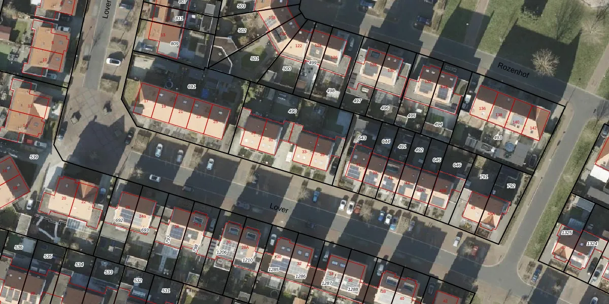 Het perceel waarop Lover 33 staat heeft een oppervlakte van 886 m². Dit is een groot perceel. De perceeloppervlakte wordt geregistreerd door het Kadaster. Gedetailleerde informatie over de maten van dit perceel kunt u vinden in het rapport Kadastrale kaart met maatvoering van Lover 33.