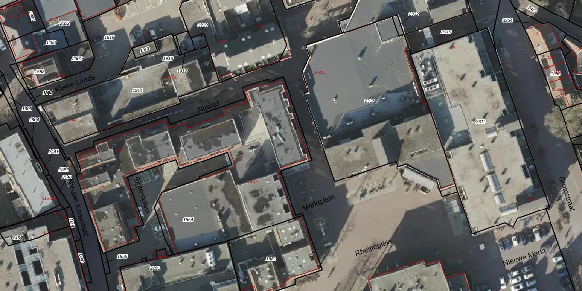 Het perceel waarop Marktplein 19-b staat heeft een oppervlakte van 2842 m². Dit is een zeer groot perceel. De perceeloppervlakte wordt geregistreerd door het Kadaster. Gedetailleerde informatie over de maten van dit perceel kunt u vinden in het rapport Kadastrale kaart met maatvoering van Marktplein 19-b.