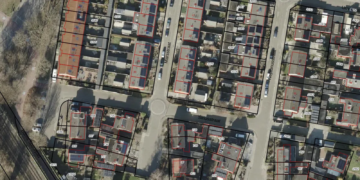 Het perceel waarop Marsstraat 29 staat heeft een oppervlakte van 2064 m². Dit is een zeer groot perceel. De perceeloppervlakte wordt geregistreerd door het Kadaster. Gedetailleerde informatie over de maten van dit perceel kunt u vinden in het rapport Kadastrale kaart met maatvoering van Marsstraat 29.