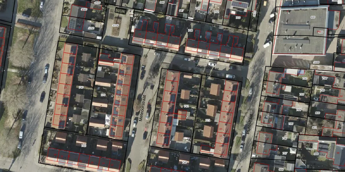 Het perceel waarop Meteoorstraat 3 staat heeft een oppervlakte van 1096 m². Dit is een zeer groot perceel. De perceeloppervlakte wordt geregistreerd door het Kadaster. Gedetailleerde informatie over de maten van dit perceel kunt u vinden in het rapport Kadastrale kaart met maatvoering van Meteoorstraat 3.
