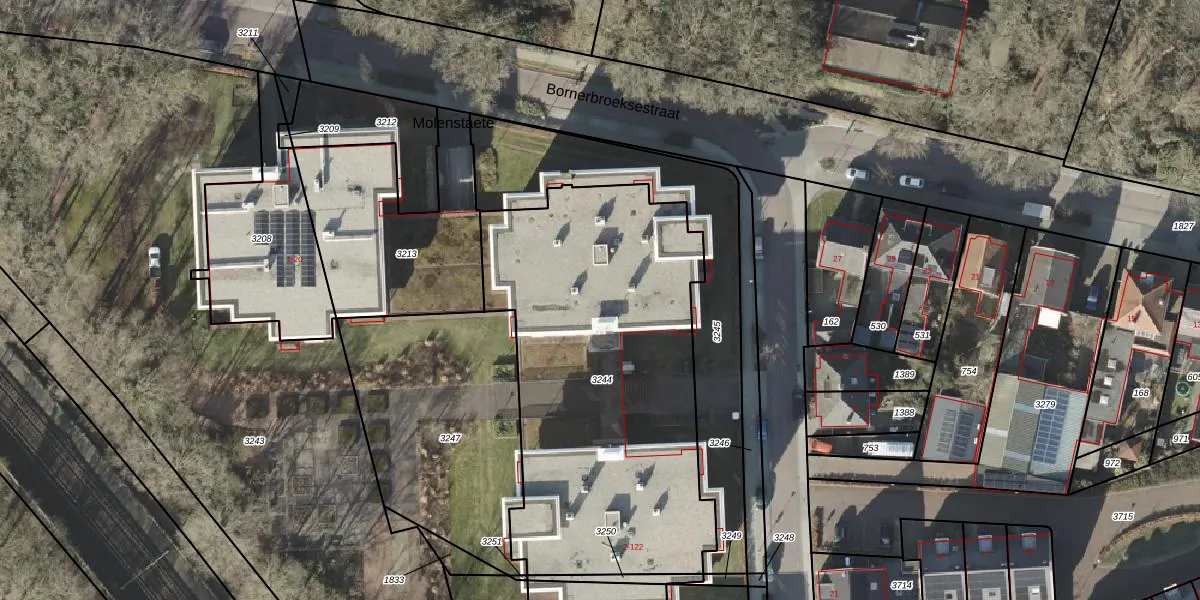 Molenstraat 54 is gelegen op kadastraal perceel BNE00K3244. Deze kadastrale aanduiding is uniek en wordt gebruikt door het Kadaster om eigendomsrechten en andere zakelijke rechten vast te leggen. Het perceel maakt onderdeel uit van de kadastrale gemeente Borne.