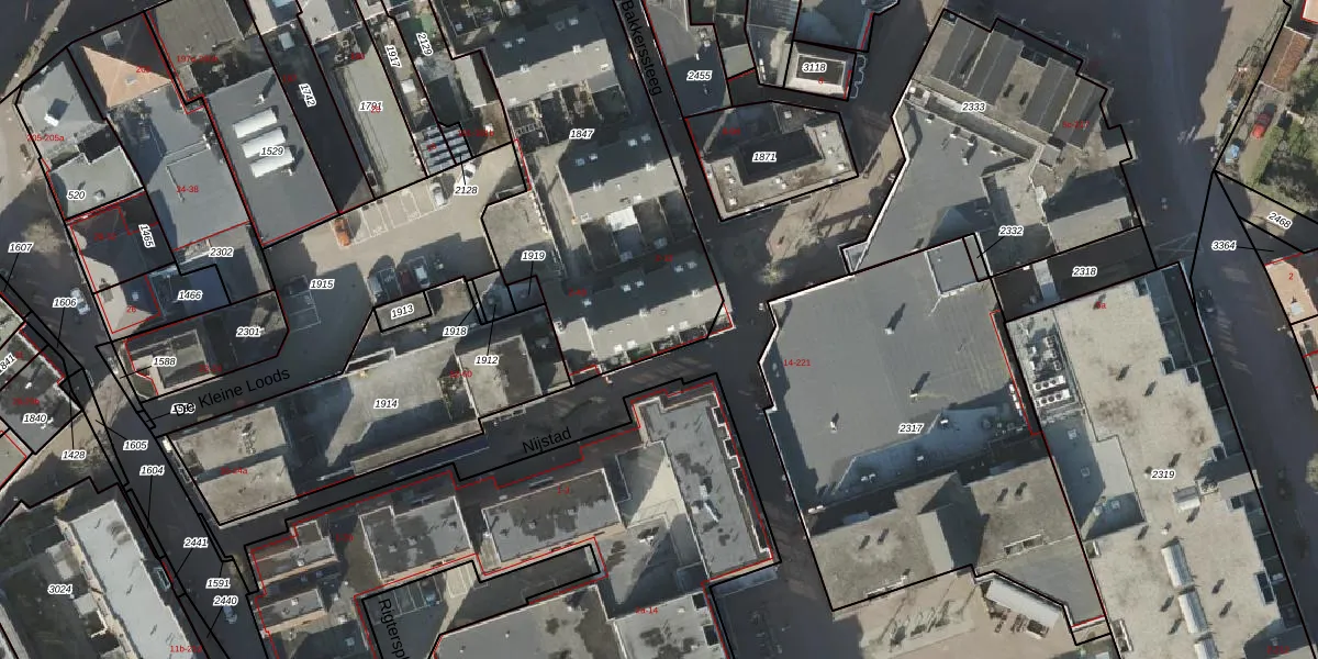 Het perceel waarop Nijstad 22 staat heeft een oppervlakte van 2012 m². Dit is een zeer groot perceel. De perceeloppervlakte wordt geregistreerd door het Kadaster. Gedetailleerde informatie over de maten van dit perceel kunt u vinden in het rapport Kadastrale kaart met maatvoering van Nijstad 22.