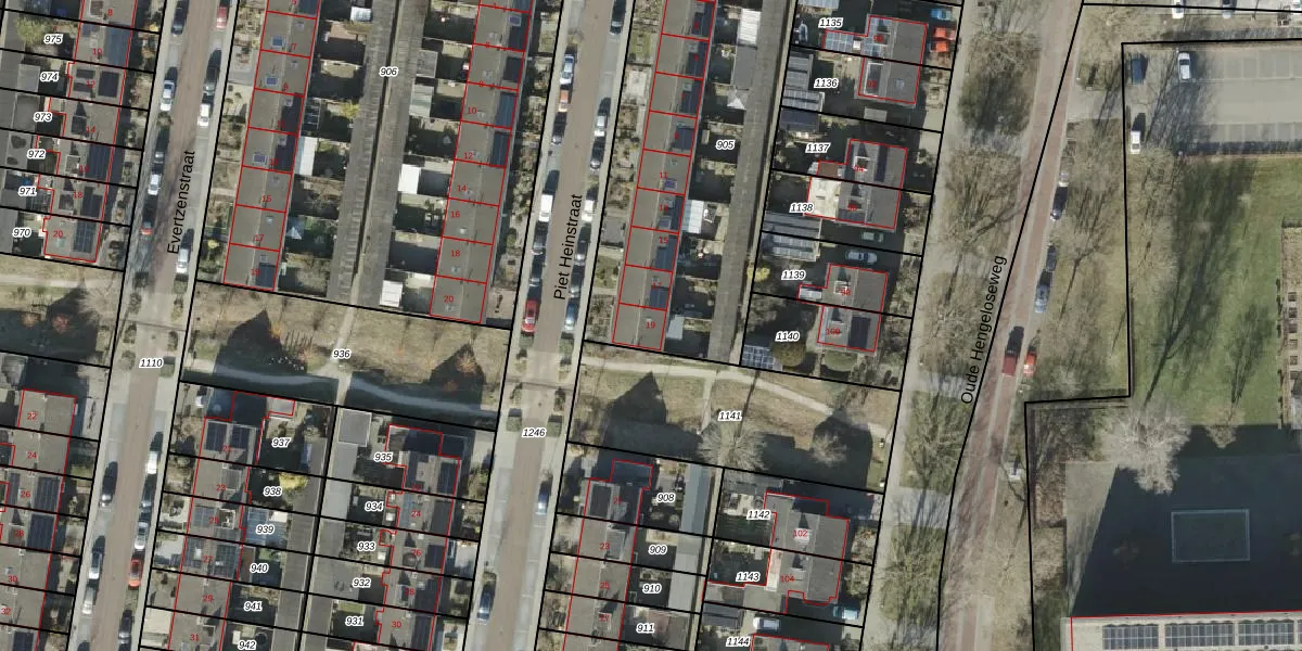 Het perceel waarop Piet Heinstraat 19 staat heeft een oppervlakte van 1524 m². Dit is een zeer groot perceel. De perceeloppervlakte wordt geregistreerd door het Kadaster. Gedetailleerde informatie over de maten van dit perceel kunt u vinden in het rapport Kadastrale kaart met maatvoering van Piet Heinstraat 19.