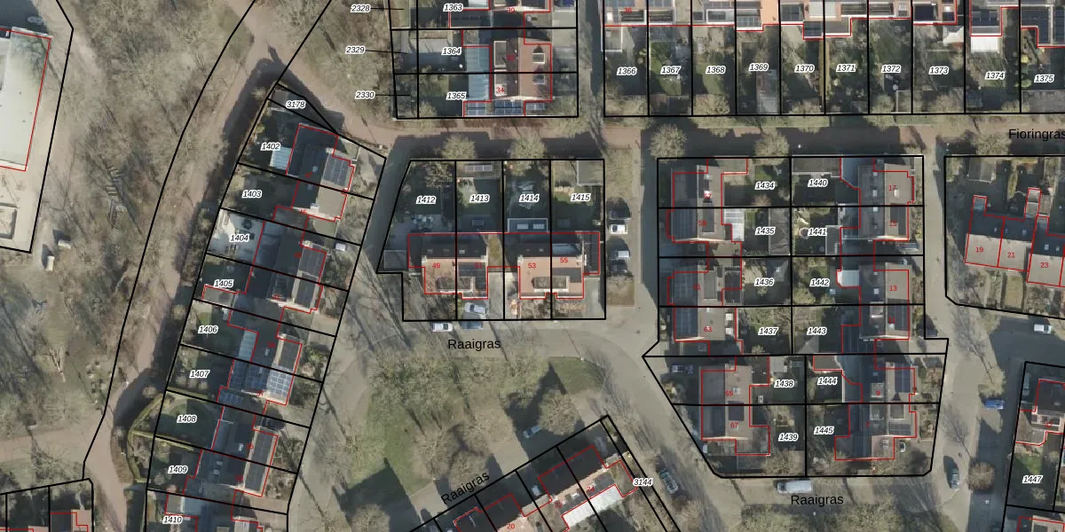 Raaigras 53 is gelegen op kadastraal perceel BNE00B1414. Deze kadastrale aanduiding is uniek en wordt gebruikt door het Kadaster om eigendomsrechten en andere zakelijke rechten vast te leggen. Het perceel maakt onderdeel uit van de kadastrale gemeente Borne.