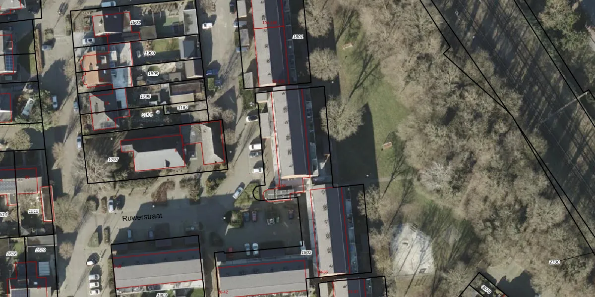 Het perceel waarop Ruwerstraat 80 staat heeft een oppervlakte van 2132 m². Dit is een zeer groot perceel. De perceeloppervlakte wordt geregistreerd door het Kadaster. Gedetailleerde informatie over de maten van dit perceel kunt u vinden in het rapport Kadastrale kaart met maatvoering van Ruwerstraat 80.