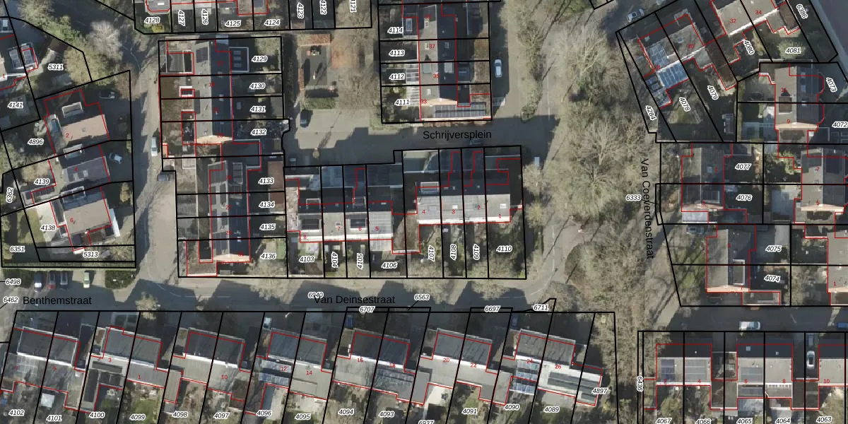 Schrijversplein 4 is gelegen op kadastraal perceel BNE00E4107. Deze kadastrale aanduiding is uniek en wordt gebruikt door het Kadaster om eigendomsrechten en andere zakelijke rechten vast te leggen. Het perceel maakt onderdeel uit van de kadastrale gemeente Borne.