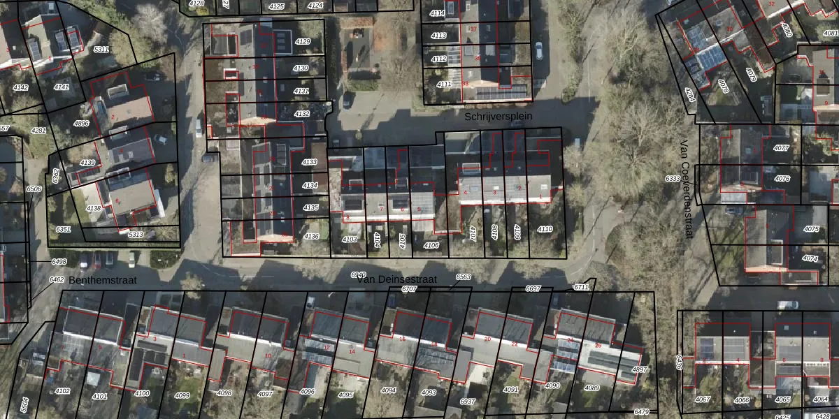 Schrijversplein 5 is gelegen op kadastraal perceel BNE00E4106. Deze kadastrale aanduiding is uniek en wordt gebruikt door het Kadaster om eigendomsrechten en andere zakelijke rechten vast te leggen. Het perceel maakt onderdeel uit van de kadastrale gemeente Borne.