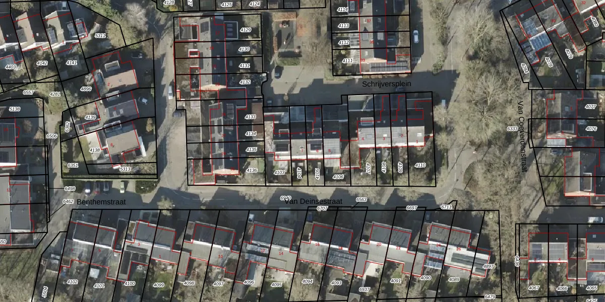 Schrijversplein 7 is gelegen op kadastraal perceel BNE00E4104. Deze kadastrale aanduiding is uniek en wordt gebruikt door het Kadaster om eigendomsrechten en andere zakelijke rechten vast te leggen. Het perceel maakt onderdeel uit van de kadastrale gemeente Borne.