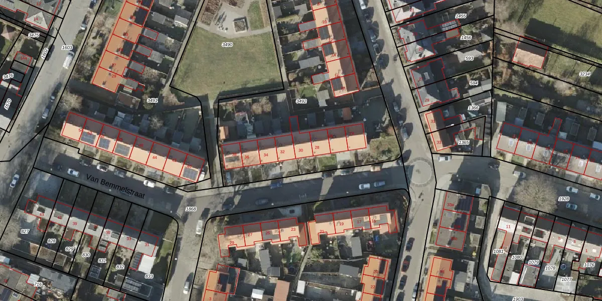 Het perceel waarop Van Bemmelstraat 30 staat heeft een oppervlakte van 2875 m². Dit is een zeer groot perceel. De perceeloppervlakte wordt geregistreerd door het Kadaster. Gedetailleerde informatie over de maten van dit perceel kunt u vinden in het rapport Kadastrale kaart met maatvoering van Van Bemmelstraat 30.