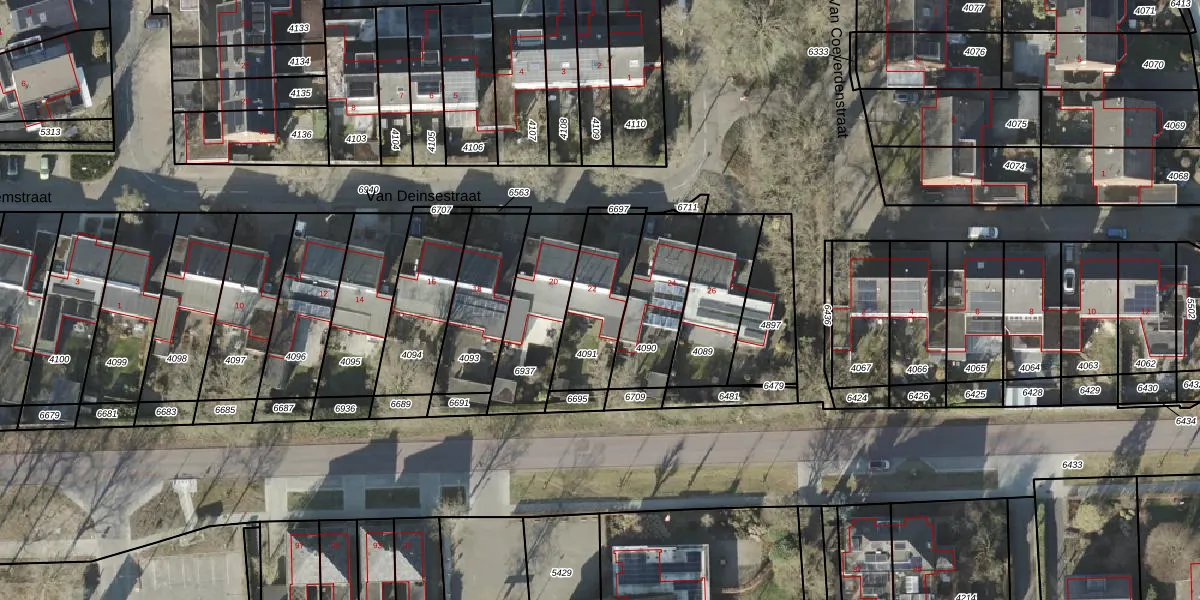 Het perceel waarop Van Deinsestraat 22 staat heeft een oppervlakte van 286 m². Dit is een middelgroot perceel. De perceeloppervlakte wordt geregistreerd door het Kadaster. Gedetailleerde informatie over de maten van dit perceel kunt u vinden in het rapport Kadastrale kaart met maatvoering van Van Deinsestraat 22.