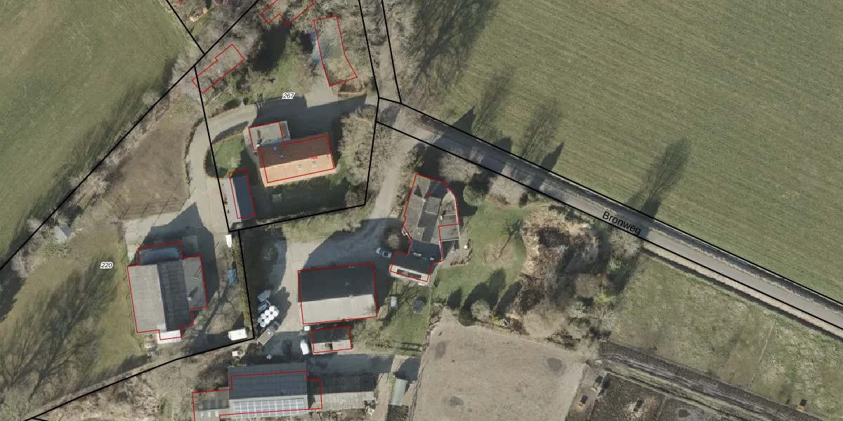 Het perceel waarop Bronweg 6 staat heeft een oppervlakte van 1,5 ha. Dit is een zeer groot perceel. De perceeloppervlakte wordt geregistreerd door het Kadaster. Gedetailleerde informatie over de maten van dit perceel kunt u vinden in het rapport Kadastrale kaart met maatvoering van Bronweg 6.