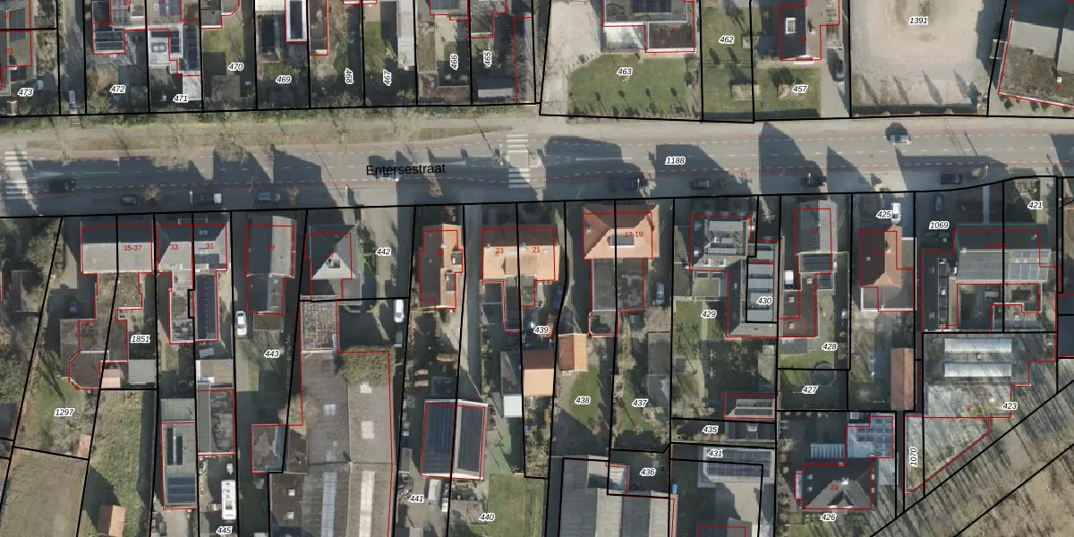 Entersestraat 21 is gelegen op kadastraal perceel AML01O439. Deze kadastrale aanduiding is uniek en wordt gebruikt door het Kadaster om eigendomsrechten en andere zakelijke rechten vast te leggen. Het perceel maakt onderdeel uit van de kadastrale gemeente Ambt-Almelo.