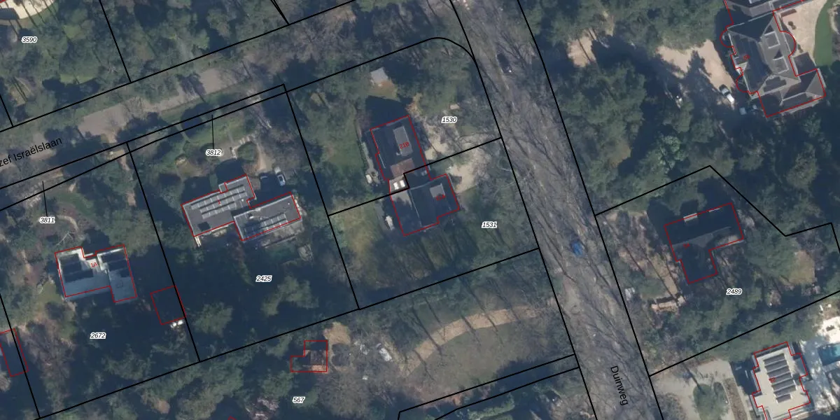 Het perceel waarop Duinweg 21-A staat heeft een oppervlakte van 1159 m². Dit is een zeer groot perceel. De perceeloppervlakte wordt geregistreerd door het Kadaster. Gedetailleerde informatie over de maten van dit perceel kunt u vinden in het rapport Kadastrale kaart met maatvoering van Duinweg 21-A.