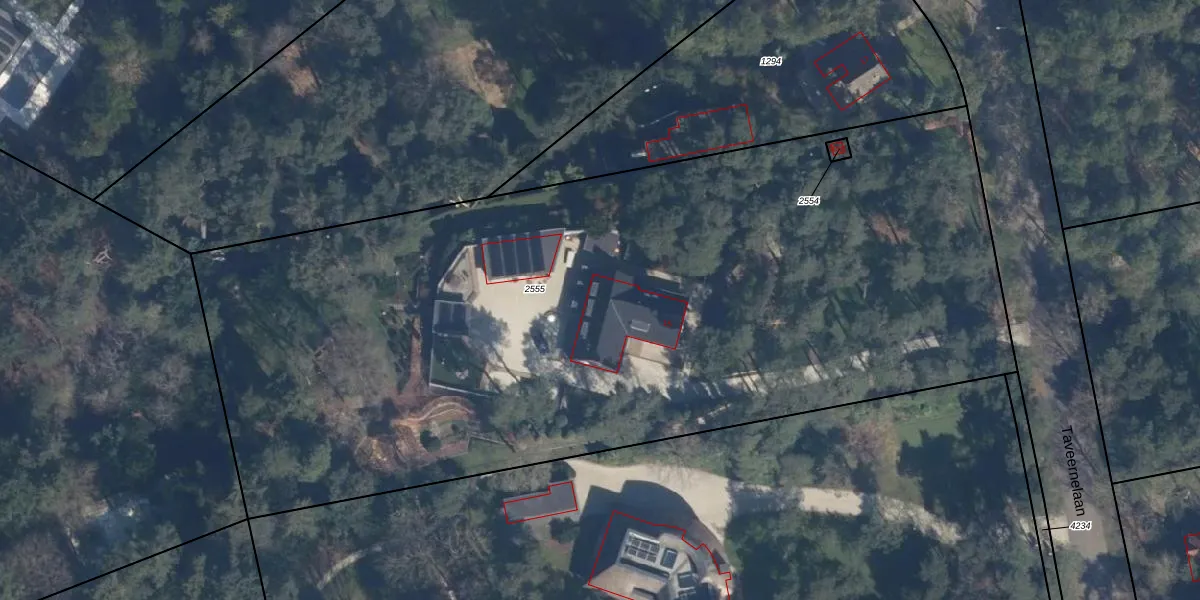 Het perceel waarop Taveernelaan 15 staat heeft een oppervlakte van 5888 m². Dit is een zeer groot perceel. De perceeloppervlakte wordt geregistreerd door het Kadaster. Gedetailleerde informatie over de maten van dit perceel kunt u vinden in het rapport Kadastrale kaart met maatvoering van Taveernelaan 15.