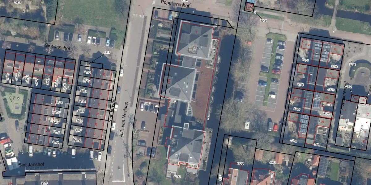 Het perceel waarop A.P. van Neslaan 27 staat heeft een oppervlakte van 2977 m². Dit is een zeer groot perceel. De perceeloppervlakte wordt geregistreerd door het Kadaster. Gedetailleerde informatie over de maten van dit perceel kunt u vinden in het rapport Kadastrale kaart met maatvoering van A.P. van Neslaan 27.
