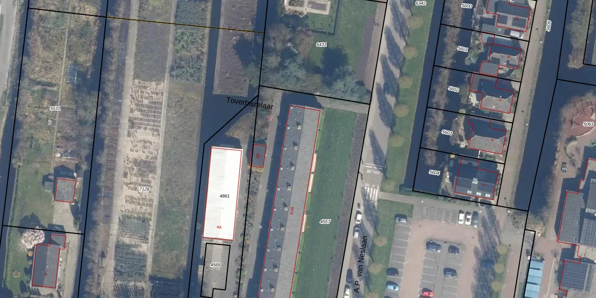 A.P. van Neslaan 44 is gelegen op kadastraal perceel BKP00B4557. Deze kadastrale aanduiding is uniek en wordt gebruikt door het Kadaster om eigendomsrechten en andere zakelijke rechten vast te leggen. Het perceel maakt onderdeel uit van de kadastrale gemeente Boskoop.