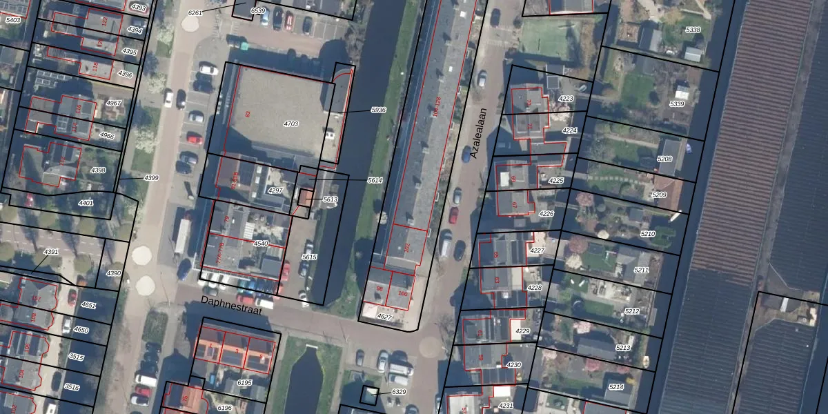Azalealaan 106 is gelegen op kadastraal perceel BKP00B4627. Deze kadastrale aanduiding is uniek en wordt gebruikt door het Kadaster om eigendomsrechten en andere zakelijke rechten vast te leggen. Het perceel maakt onderdeel uit van de kadastrale gemeente Boskoop.