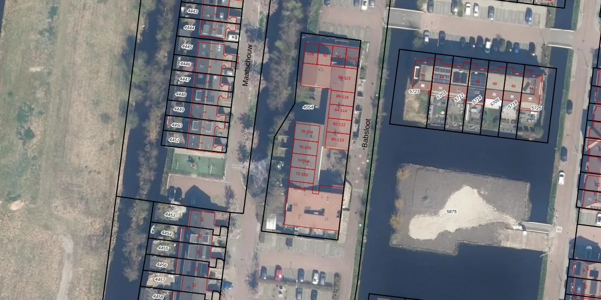 Babsloot 106 is gelegen op kadastraal perceel BKP00A4054. Deze kadastrale aanduiding is uniek en wordt gebruikt door het Kadaster om eigendomsrechten en andere zakelijke rechten vast te leggen. Het perceel maakt onderdeel uit van de kadastrale gemeente Boskoop.