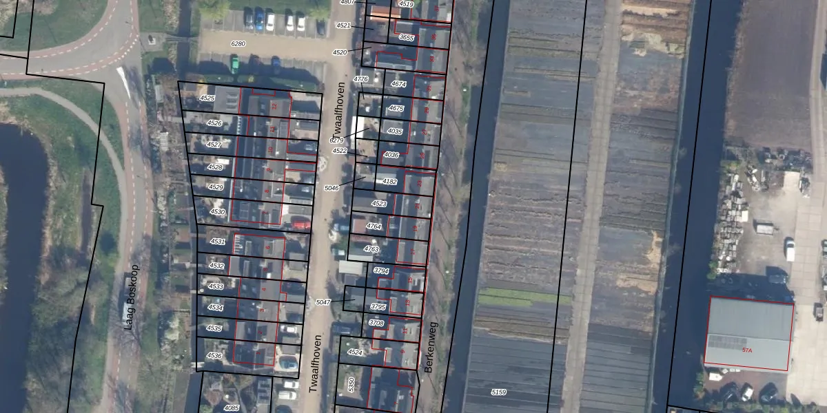 Het adres ligt op het perceel BKP00-A-4523, dat zich in de kadastrale gemeente Boskoop bevindt. De gemiddelde perceelgrootte in Boskoop is 1882,49 m². Dit perceel is kleiner: de perceeloppervlakte bedraagt 110 m². Het kleinste perceel in de kadastrale gemeente is 0 m² groot. De grootste perceeloppervlakte is 20,7 ha. Er zijn geen andere adressen aanwezig op het perceel. De huidige grenzen van het perceel zijn digitaal in de Basisregistratie Kadaster (BRK) geregistreerd op 29-11-2002.