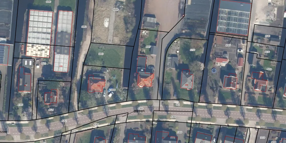 Biezen 104 is gelegen op kadastraal perceel BKP00B4447. Deze kadastrale aanduiding is uniek en wordt gebruikt door het Kadaster om eigendomsrechten en andere zakelijke rechten vast te leggen. Het perceel maakt onderdeel uit van de kadastrale gemeente Boskoop.