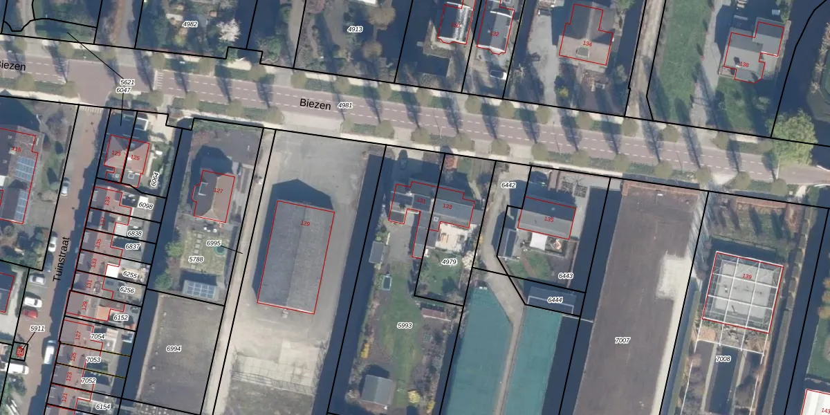 Het perceel waarop Biezen 131 staat heeft een oppervlakte van 1325 m². Dit is een zeer groot perceel. De perceeloppervlakte wordt geregistreerd door het Kadaster. Gedetailleerde informatie over de maten van dit perceel kunt u vinden in het rapport Kadastrale kaart met maatvoering van Biezen 131.