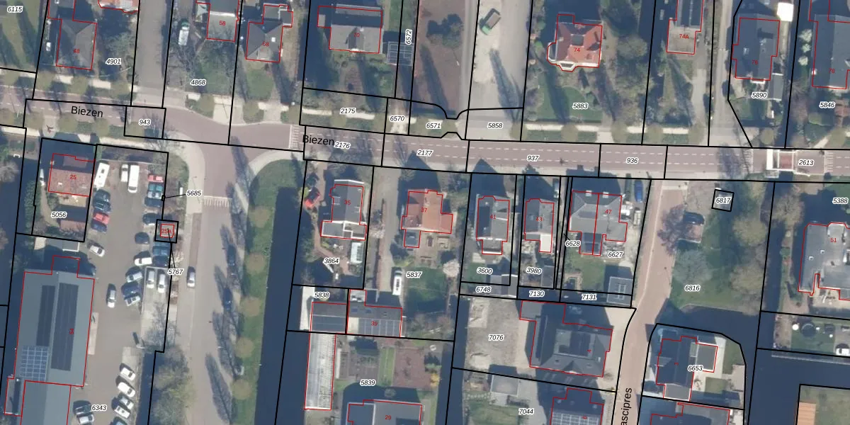 Het perceel waarop Biezen 37 staat heeft een oppervlakte van 943 m². Dit is een groot perceel. De perceeloppervlakte wordt geregistreerd door het Kadaster. Gedetailleerde informatie over de maten van dit perceel kunt u vinden in het rapport Kadastrale kaart met maatvoering van Biezen 37.