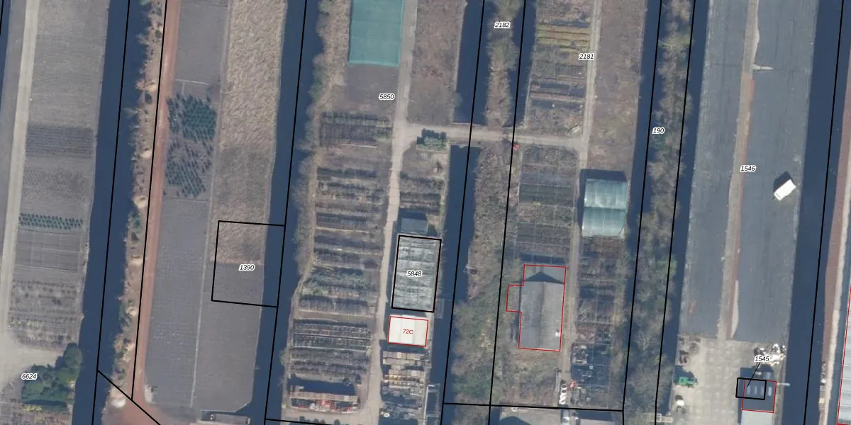Het perceel waarop het adres ligt is BKP00-B-5850. De afkorting 'BKP00' staat voor kadastrale gemeente Boskoop. Het perceel is met 1,1 ha relatief groot. Het gemiddelde ligt in de kadastrale gemeente Boskoop op 1879,99 m². Het grootste perceel in de kadastrale gemeente is 20,7 ha. Het kleinste perceel heeft een oppervlakte van 0 m². Er zijn 2 adressen aanwezig op het perceel. De huidige grenzen van het perceel zijn digitaal in de Basisregistratie Kadaster (BRK) geregistreerd op 03-03-2009.