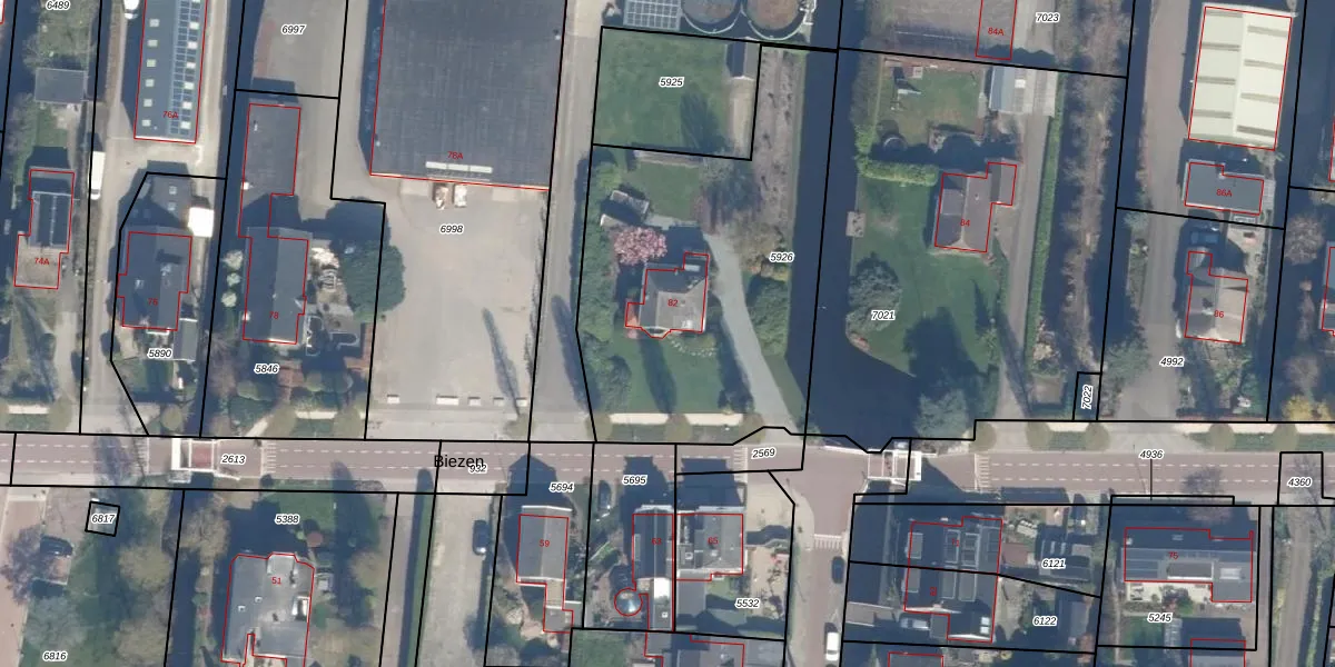 Het perceel waarop Biezen 82 staat heeft een oppervlakte van 1595 m². Dit is een zeer groot perceel. De perceeloppervlakte wordt geregistreerd door het Kadaster. Gedetailleerde informatie over de maten van dit perceel kunt u vinden in het rapport Kadastrale kaart met maatvoering van Biezen 82.