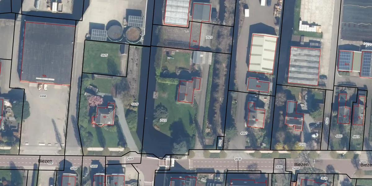 Biezen 84 is gelegen op kadastraal perceel BKP00B7021. Deze kadastrale aanduiding is uniek en wordt gebruikt door het Kadaster om eigendomsrechten en andere zakelijke rechten vast te leggen. Het perceel maakt onderdeel uit van de kadastrale gemeente Boskoop.