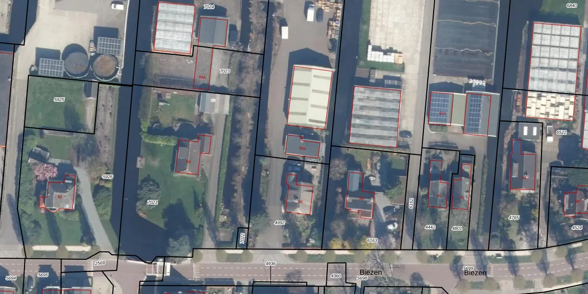 Het perceel waarop Biezen 86-A staat heeft een oppervlakte van 1,0 ha. Dit is een zeer groot perceel. De perceeloppervlakte wordt geregistreerd door het Kadaster. Gedetailleerde informatie over de maten van dit perceel kunt u vinden in het rapport Kadastrale kaart met maatvoering van Biezen 86-A.