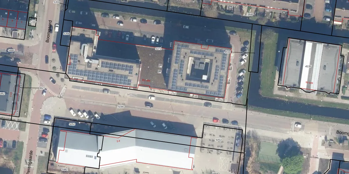 Het perceel waarop Boomgaard 157 staat heeft een oppervlakte van 4960 m². Dit is een zeer groot perceel. De perceeloppervlakte wordt geregistreerd door het Kadaster. Gedetailleerde informatie over de maten van dit perceel kunt u vinden in het rapport Kadastrale kaart met maatvoering van Boomgaard 157.